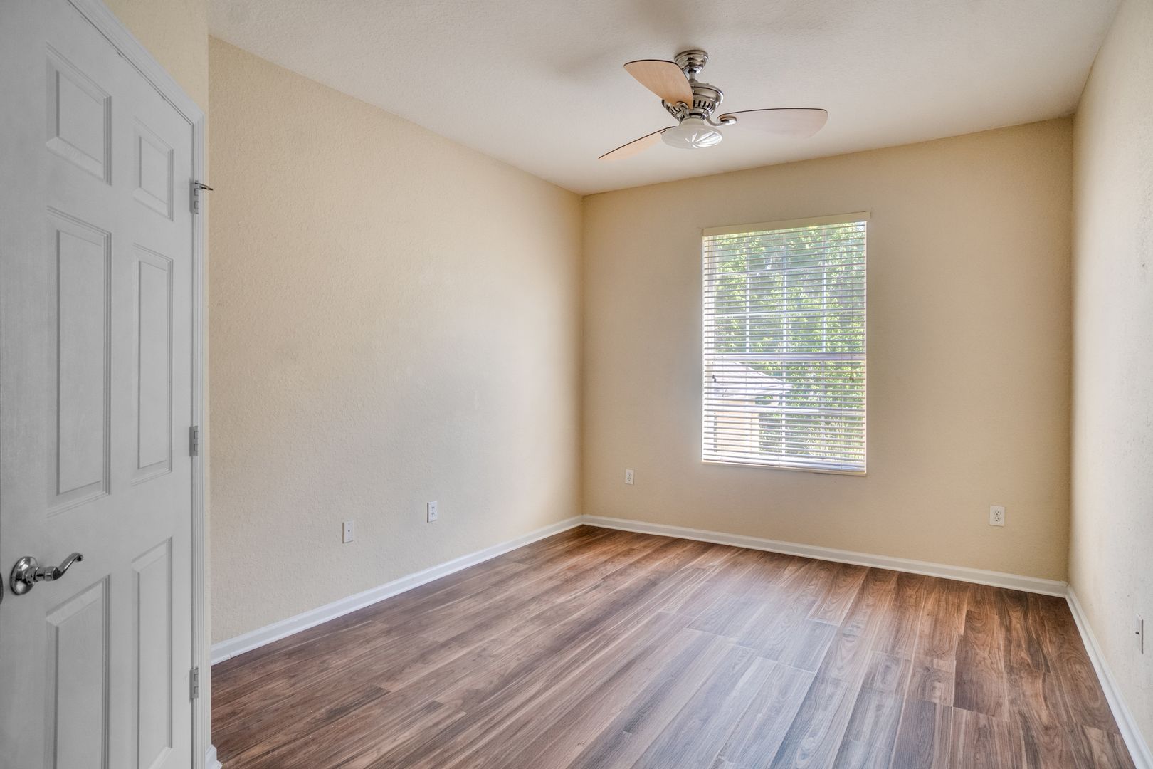 Inside, the condo features neutral paint throughout, luxury vinyl flooring in the main living areas, and brand-new luxury vinyl flooring in all bedrooms, with ceramic tile in the kitchen and bathrooms. The home offers a thoughtfully designed split floor plan with high ceilings throughout, creating an open and comfortable living space.