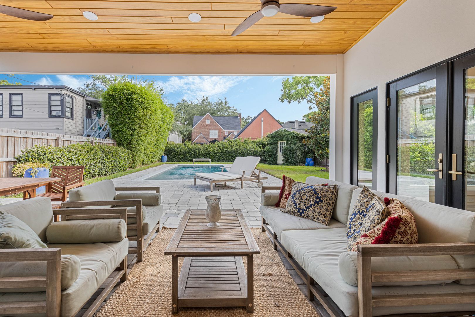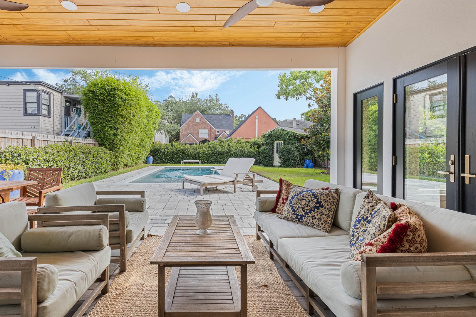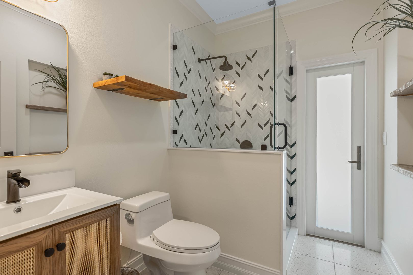 Throughout the downstairs, you’ll also find custom details like new crown molding, custom floating shelves, dimmable lighting, and select new windows. The stylish pool bath is complete with terrazzo floors, a stand-up shower, and handcrafted wood shelving.