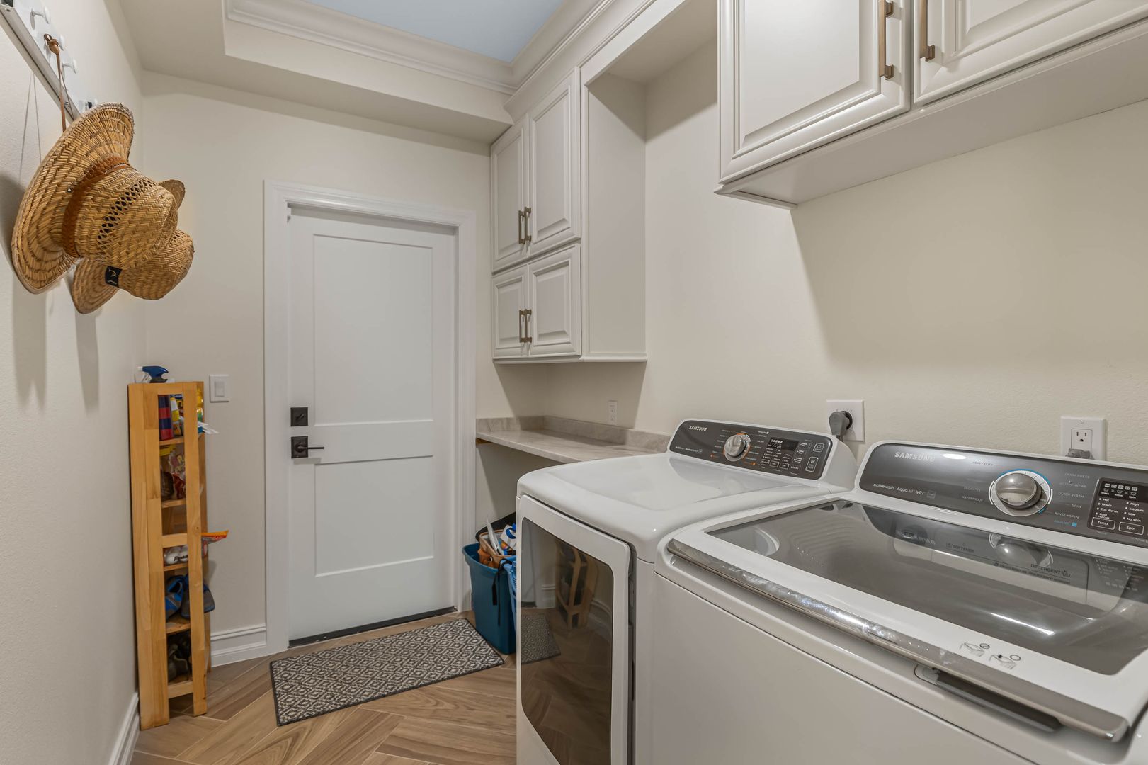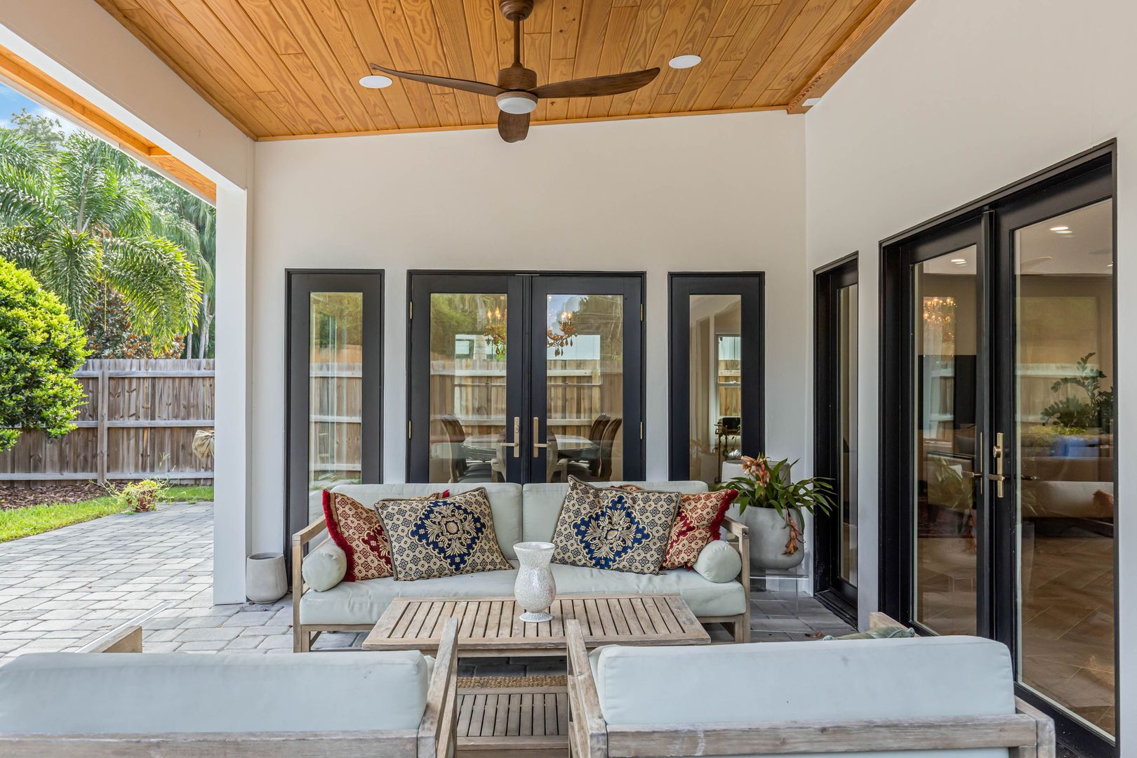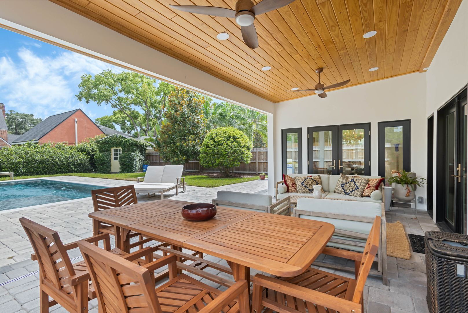 Throughout the downstairs, you’ll also find custom details like new crown molding, custom floating shelves, dimmable lighting, and select new windows. The stylish pool bath is complete with terrazzo floors, a stand-up shower, and handcrafted wood shelving.