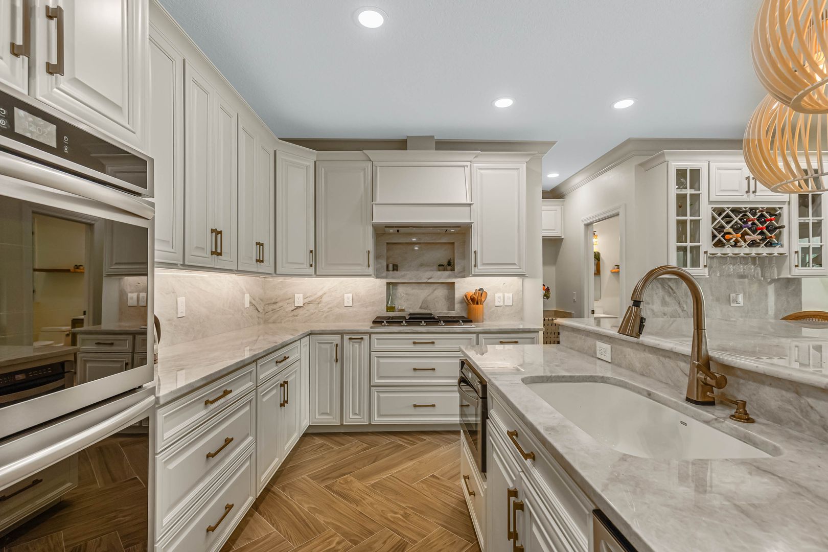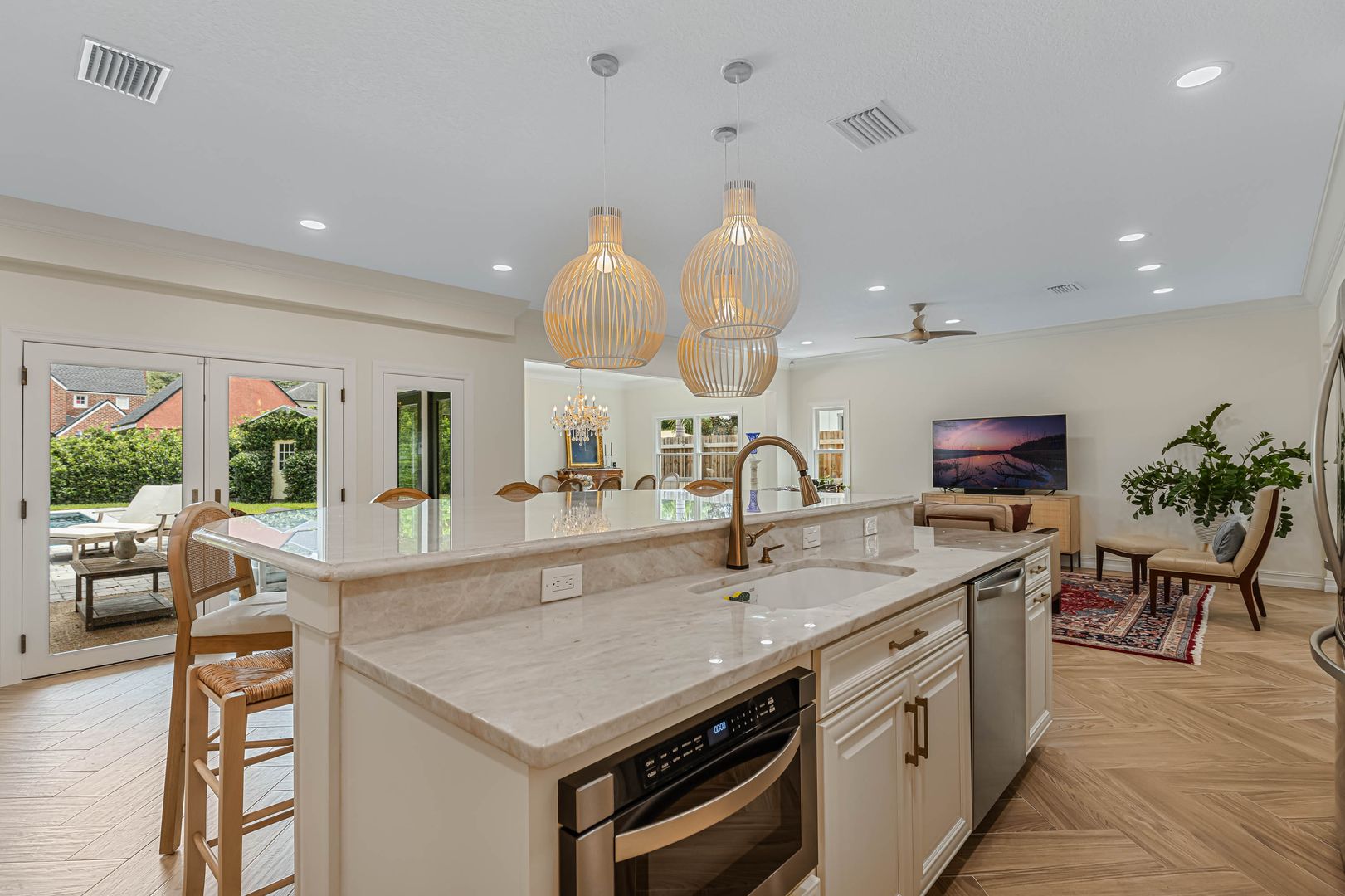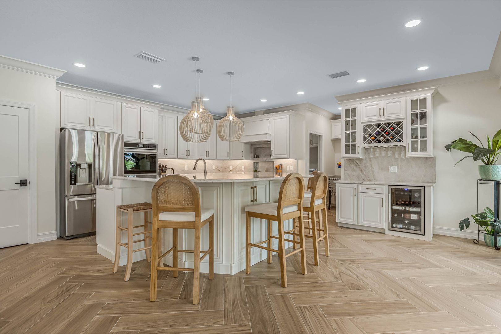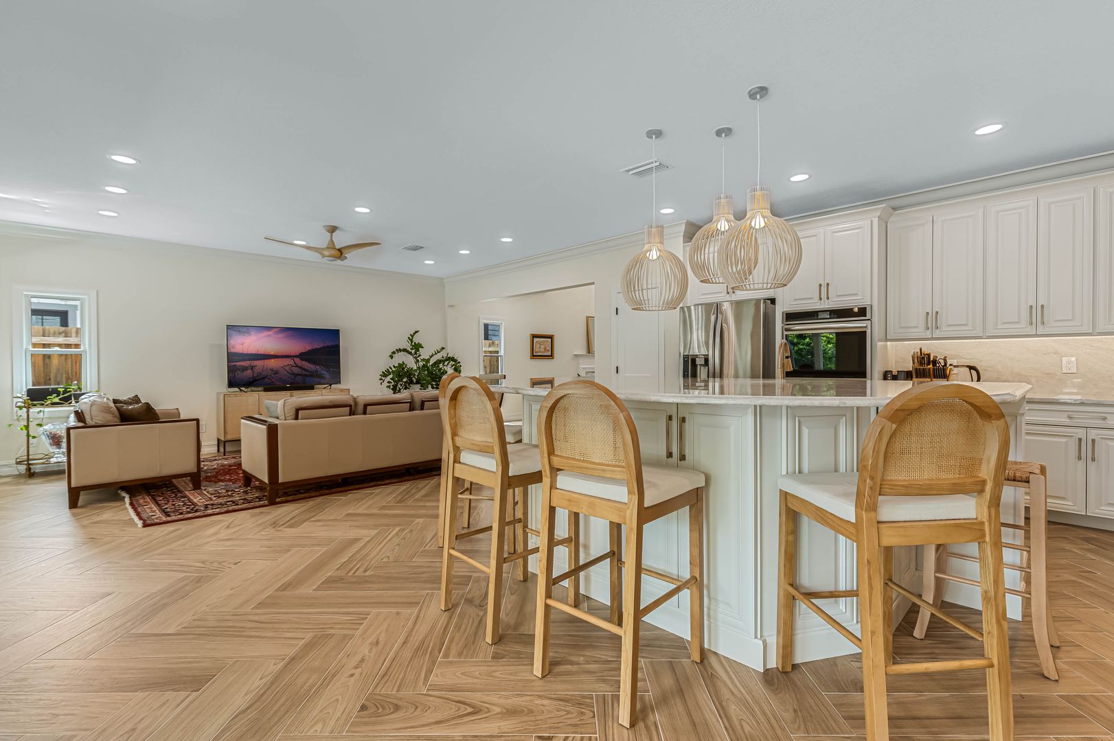 The main living areas flow seamlessly in an open-concept layout connecting the family room, dining room, and a stunning, completely redesigned kitchen. Featuring Taj Mahal Quartzite countertops imported from Brazil, cream cabinetry with champagne bronze hardware, stainless steel appliances including a double oven and drawer microwave, a wet bar with built-in fridge, and a generous island—this kitchen is a true showstopper.