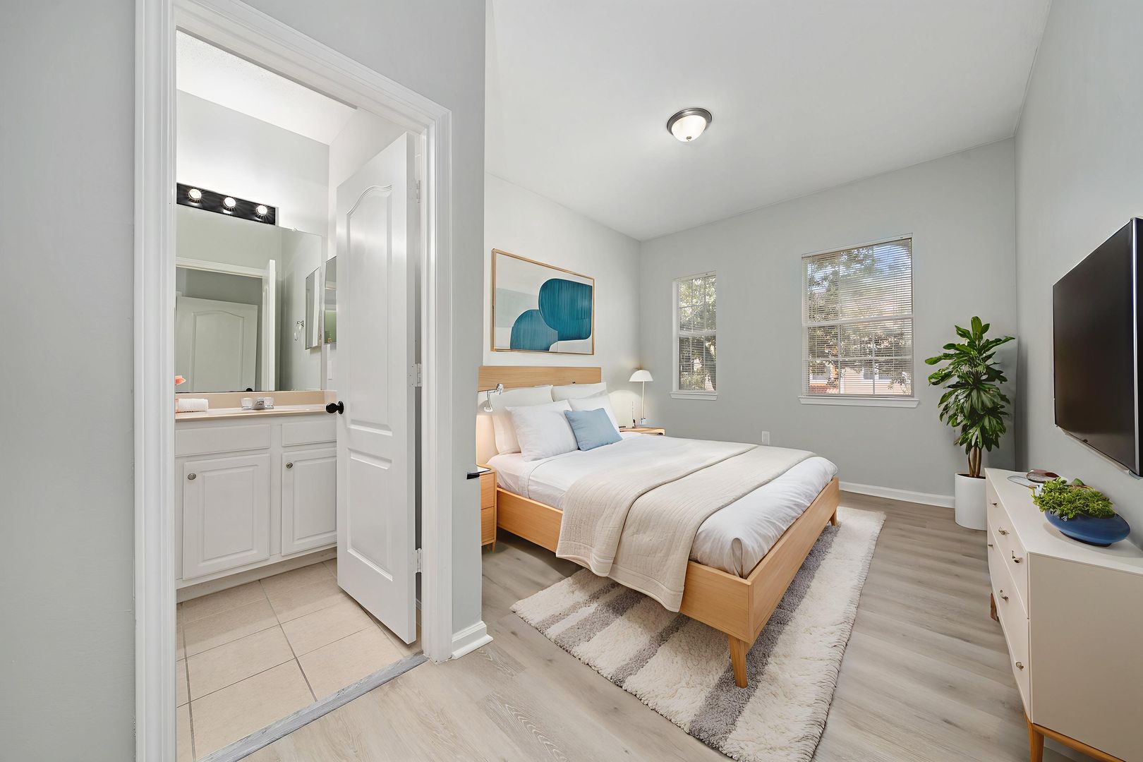 This spacious 2-bedroom, 2-bathroom townhome-style condo features a smart split layout with an open design, private entry, and a generously sized attached garage. The entire interior has been freshly painted, the laminate flooring is brand new, and the kitchen appliances have all been recently upgraded. The primary bedroom offers ample space, a walk-in closet, and an en suite bathroom complete with a dual-sink vanity and a tub/shower combo. You'll also find ceiling fans throughout, a dedicated indoor laundry room with shelving, and a full-sized washer and dryer included. Step outside to the screened-in patio—perfect for relaxing or enjoying a quiet meal outdoors.