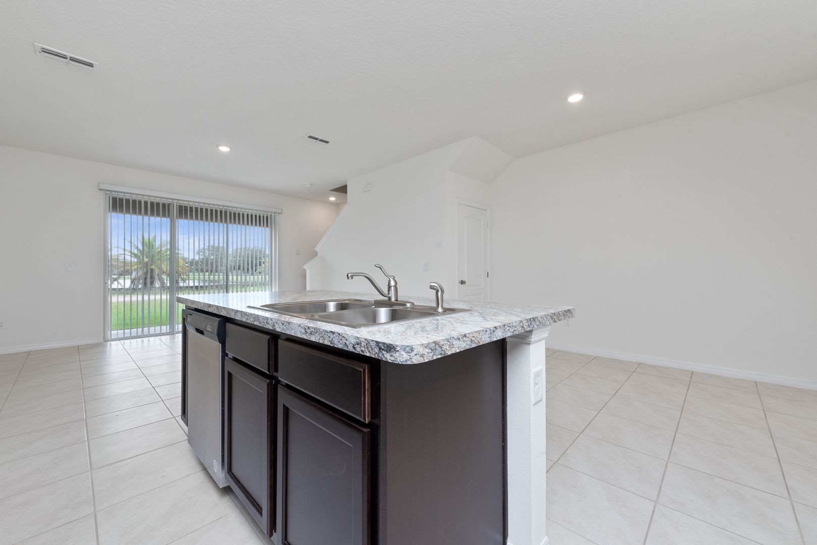 The open-concept floor plan highlights a stylish kitchen complete with stainless steel appliances, a central island with sink, breakfast bar, and a separate breakfast nook—all seamlessly connected to the family room, creating the perfect space for entertaining or everyday living.
