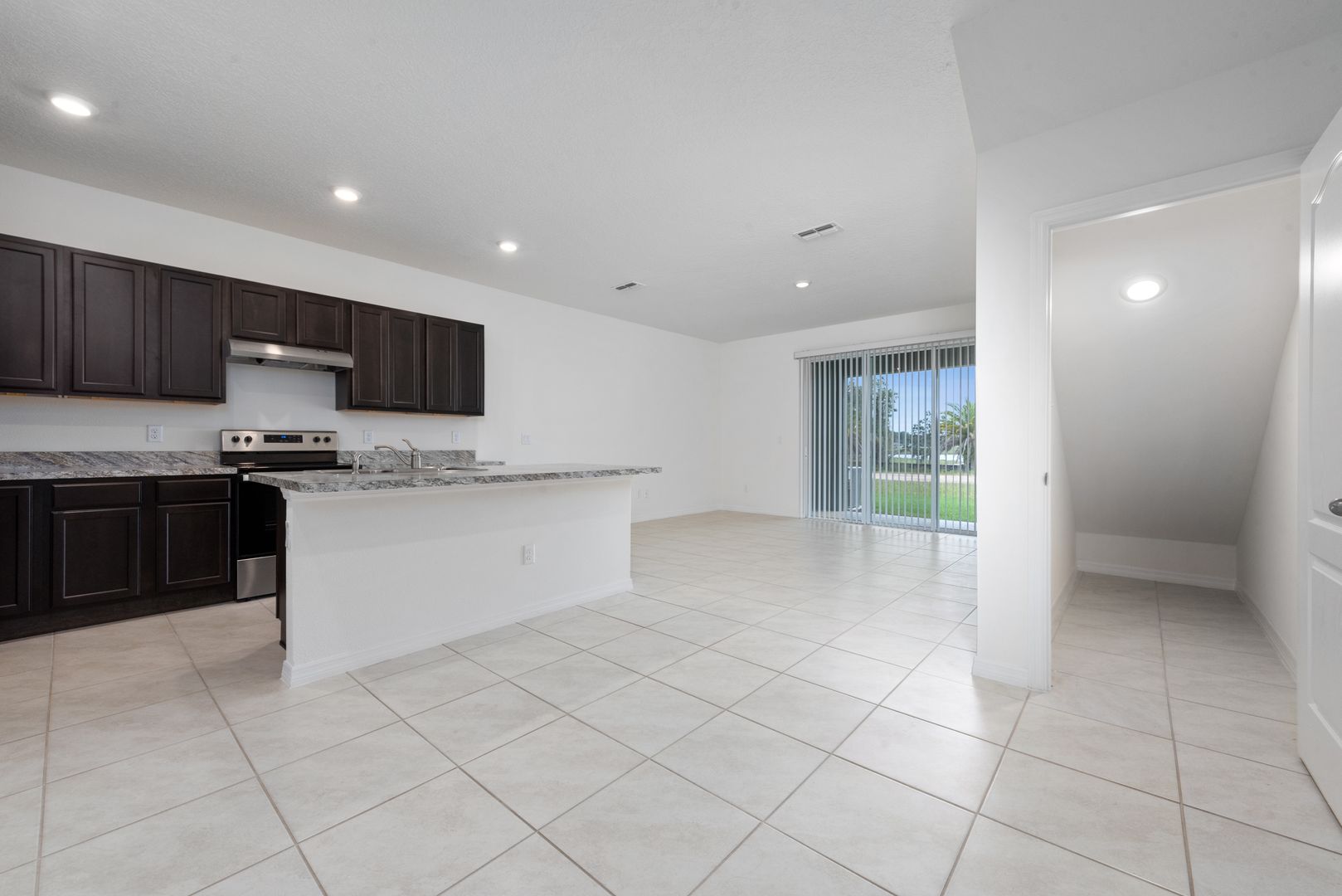 The spacious living area opens to a covered lanai through a three-panel sliding glass door, providing an inviting indoor-outdoor space to relax with family and friends. A convenient half-bath is also located on the first floor.