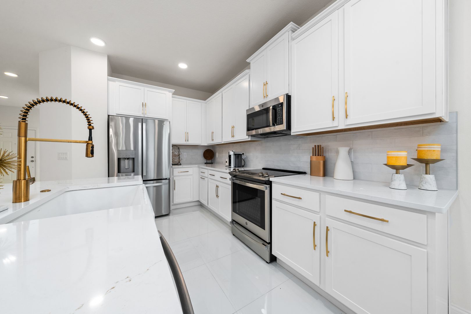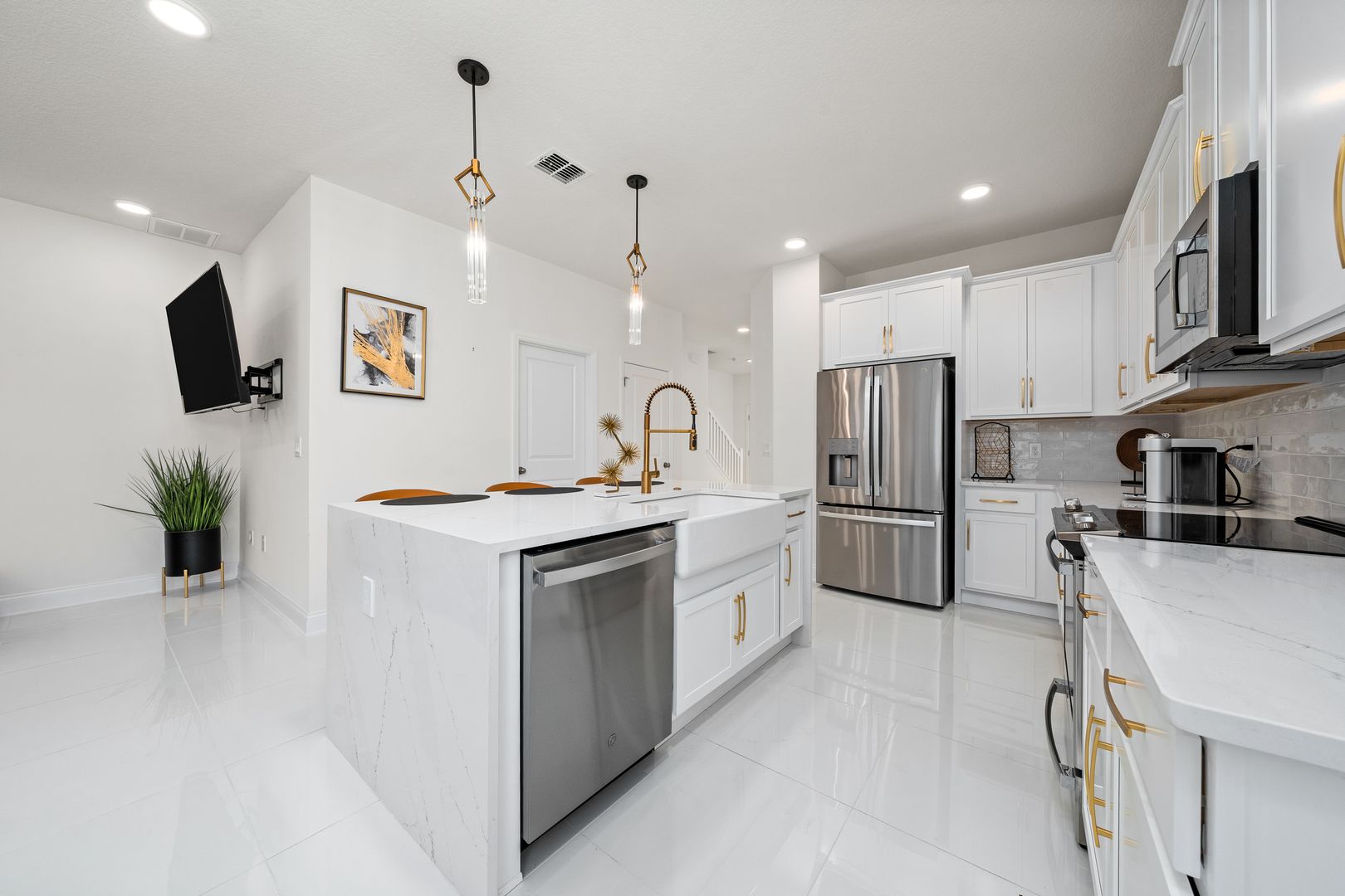 Stunning Corner Townhome for Rent in Encore at Ovation – Winter Garden, FL Welcome to this exceptional 3-bedroom + den, 2.5-bath corner unit located in the highly sought-after community of Encore at Ovation. This modern townhouse stands out for its unique upgrades and elegant design, offering both comfort and luxury. Step inside to find porcelain tile floors throughout the first level, and beautiful wood floors on the staircase and second floor. The gourmet kitchen features a waterfall island, designer backsplash, under-cabinet lighting, gold accent finishes, and high-end stainless steel appliances, perfect for those who love to cook and entertain. The home also includes modern light fixtures and ceiling fans, a two-car garage, and a private paved courtyard between the garage and the main house—ideal for relaxing or outdoor dining. Its prime location within the community is unbeatable—just across from the mailboxes and walking trails that lead to the lake. Furniture shown in the photos is not included in the rental price, but the owner is open to negotiating if the tenant wishes to keep them. Encore at Ovation offers resort-style amenities, including a community pool, fully equipped fitness center, clubhouse with social areas, dog park, playground, picnic and game areas, and beautiful walking trails around the ponds. Lawn maintenance is included. Experience modern living in one of Winter Garden’s most desirable neighborhoods — schedule your showing today!