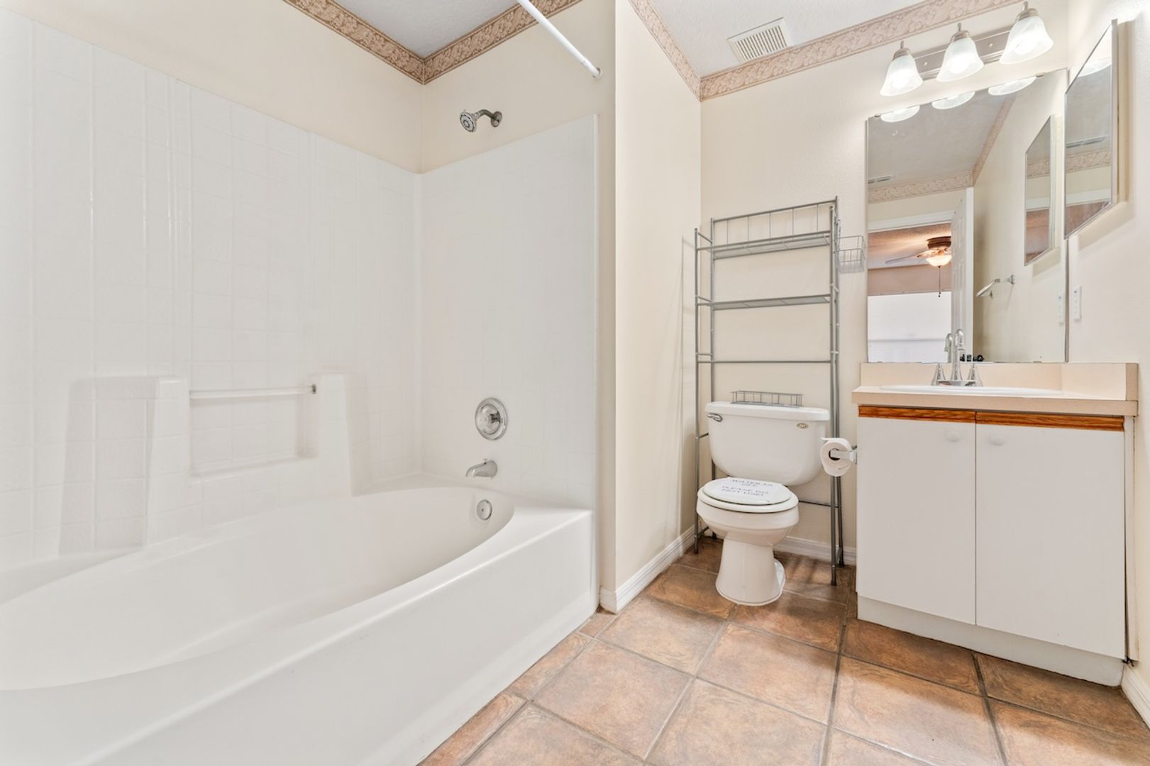 The primary bedroom suite includes a large walk-in closet and private bathroom with tub/shower combo, while two additional bedrooms share a full hall bath.